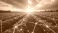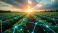 • Green farm field with glowing blue digital grid overlay at sunset. Rows of crops grow under a dramatic sky. Futuristic agriculture uses smart tech for monitoring and data analysis.