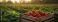 • Fresh strawberries in wooden crate at sunset in farm field, showcasing ripe red berries ready for harvest against blurred green foliage background.