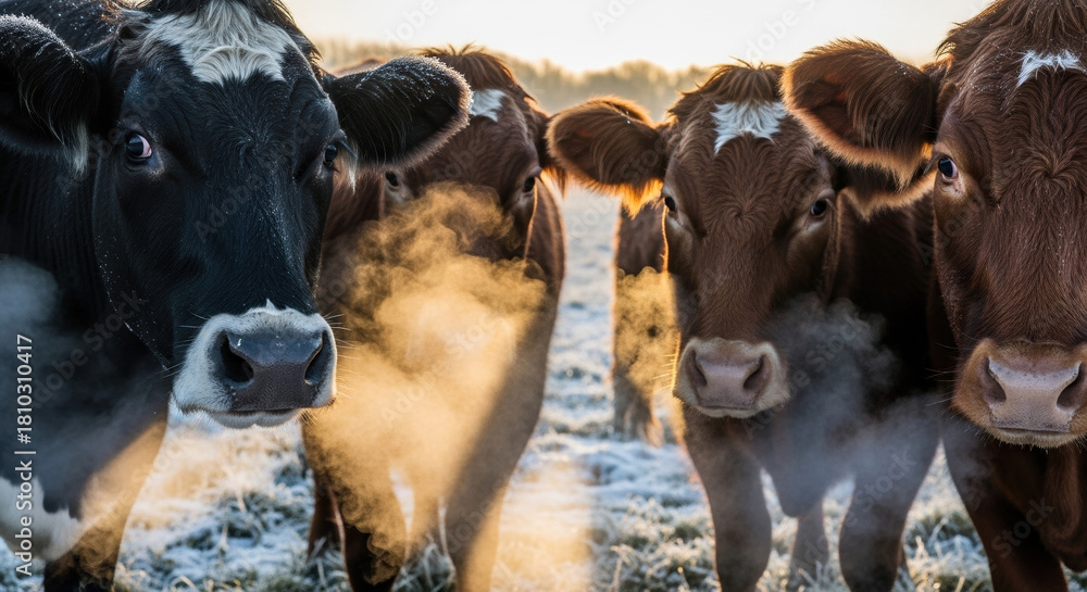 Plakat Farma - Cows with steam breath in the cold morning on frosty pasture. Close-up of cattle exhaling visible... #1810310417
