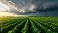 • Verdant farm field beneath a dramatic, stormy sky at sunset, a scenic panorama