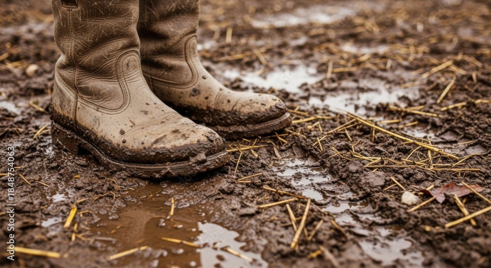 Plakat Farma - Muddy Boots Standing in a Puddle of Water and Dirt Outdoors. #1848754063