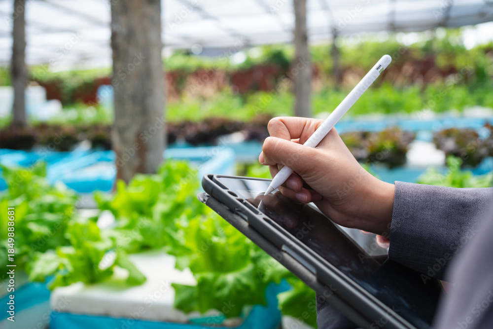 Plakat Farma - Close up of a professional using a digital tablet to monitor crop growth and farm data,... #1849888681