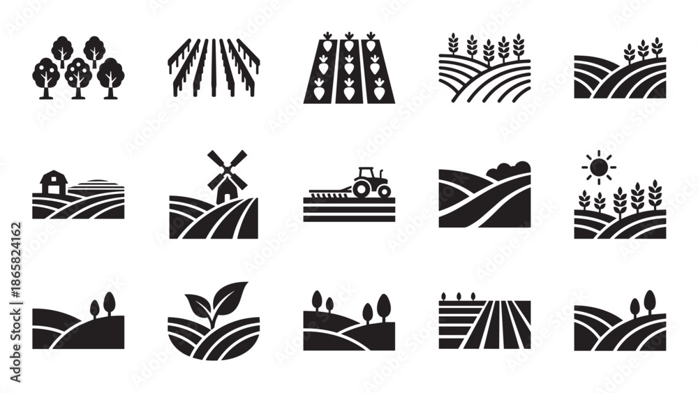 • Set of black farm and agriculture icons showing various rural scenes like fields, a tractor, a windmill, and crops in a simple glyph style collection for design