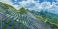 • Massive solar panel farm installed on green mountain slopes for renewable energy production under a bright blue sky.