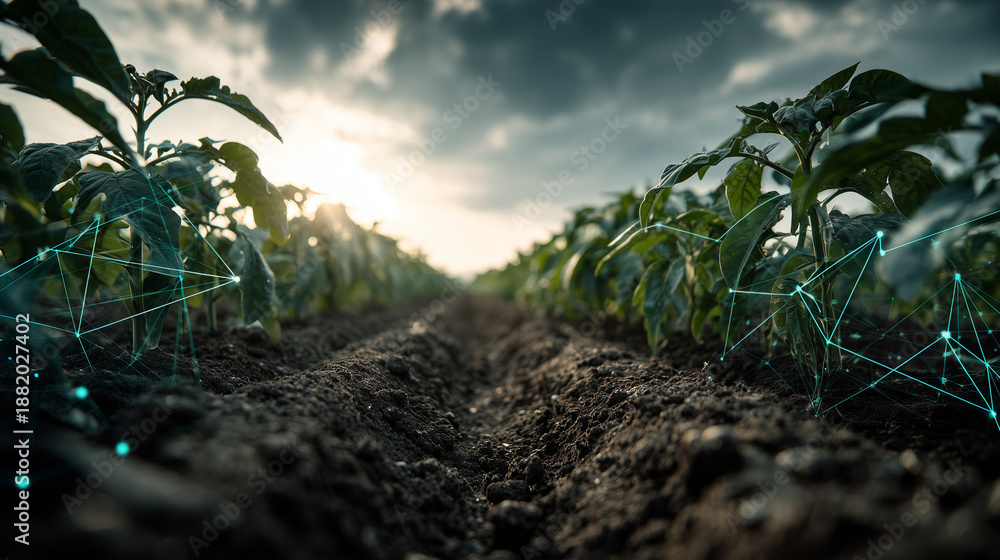 Plakat Farma - Smart agriculture concept with digital data visualization over farm field at sunrise showing... #1882027402