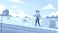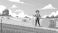 • A person stands in a harvested field with hay bales under a bright, cloudy sky
