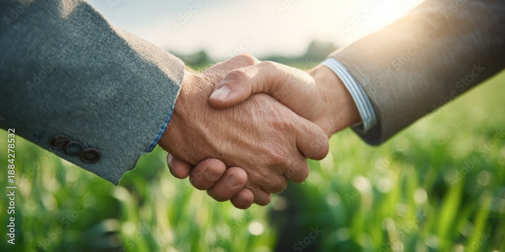 • Close-up of a business handshake in a sunny green field, symbolizing a successful agricultural partnership and sustainable business collaboration