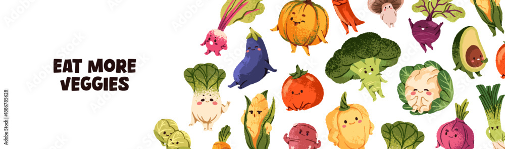 • Design of banner with kawaii vegetables characters. Template with cute veggies with different emotions, poses. Layout with funny agriculture crops, farm foods with faces. Flat vector illustration