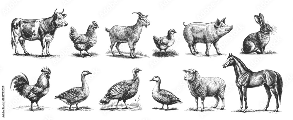 • Set of vintage hand-drawn vector illustrations of farm animals including horse, cow, goat, sheep, pig, rabbit, chicken, rooster, goose and turkey.