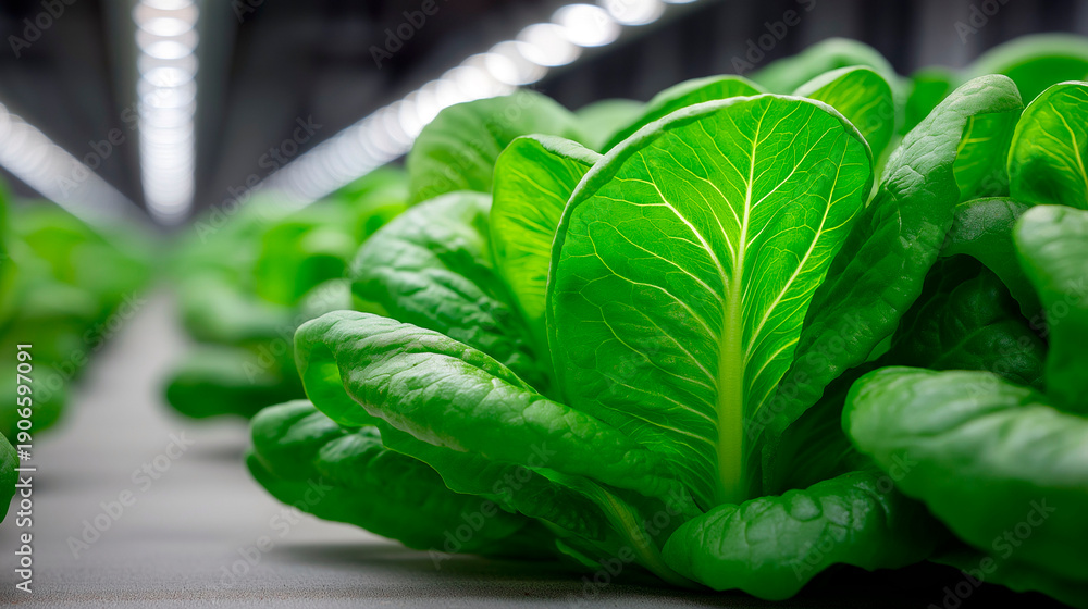 Plakat Farma - Fresh romaine lettuce growing under artificial lights in a modern indoor vertical farm #1906597091