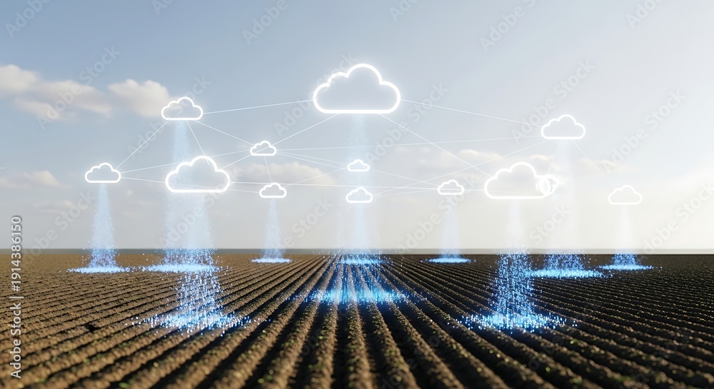 • Digital Agriculture concept with futuristic cloud computing and data transfer over a vast farm landscape