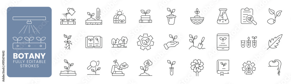 • Botany and plant science web line icon set with gardening research growth and laboratory concepts. Editable stroke