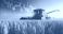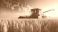 • Yellow combine harvester in golden wheat field with stock market graph