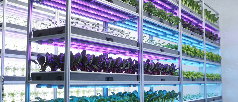 Plakat Farma - Modern Vertical Farm Interior with Rows of Leafy Greens Growing Under Pink and Blue LED Grow... #1922036121