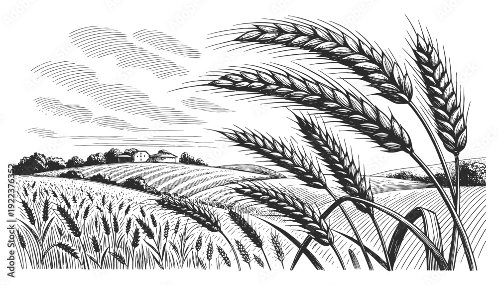 • Vintage engraved wheat field landscape with farm buildings. Hand drawn black and white vector illustration in detailed retro line art style.