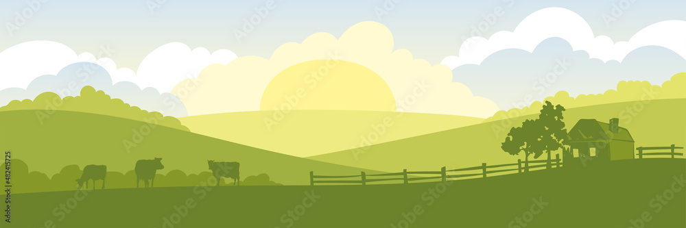 • Abstract rural landscape with cows and farm house. Vector illustration, fields and meadows