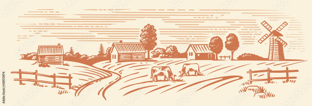 Plakat Farma - Rural landscape, agriculture farm vector. Cows #581170974
