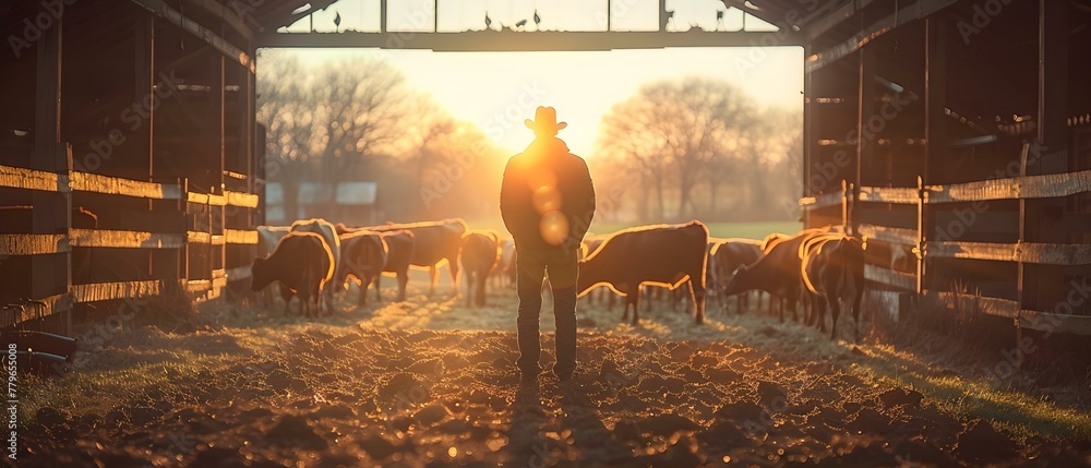 Plakat Farma - Cows in stables being fed by worker in cattle farm barn. Concept Livestock feeding, Cattle... #779655008