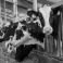 Plakat Farma - spotted black and white cows inside barn of dutch farm in holland #854204086