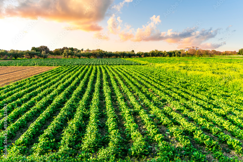 Plakat Farma - beautiful farmland landscape with green rows of plants and vegetables on a spring or summer farm... #854633603