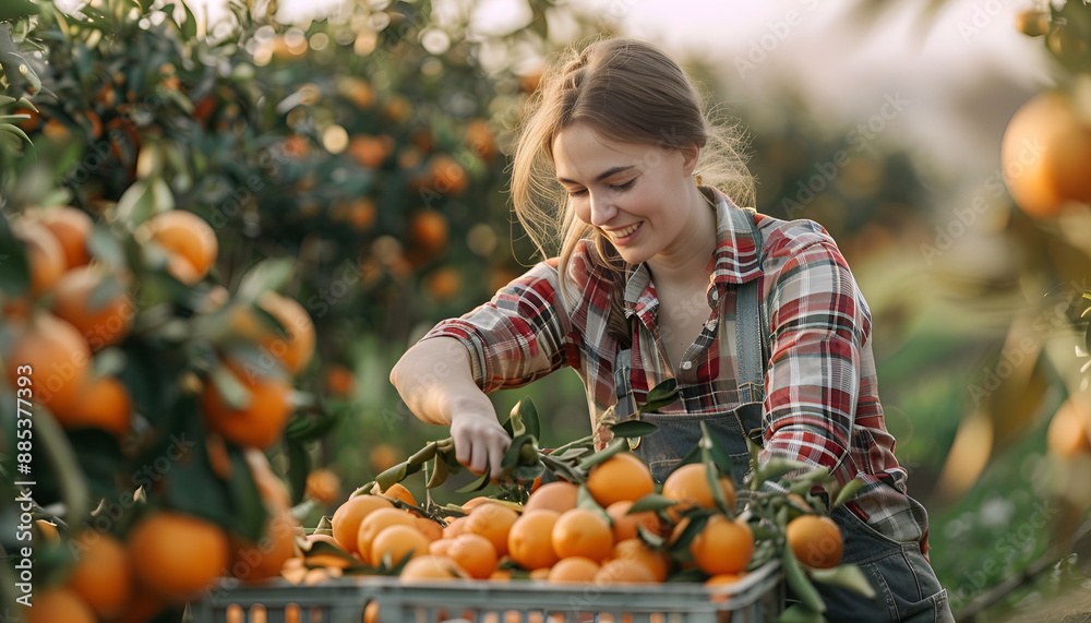 Plakat Farma - Skilled young woman farmer employee in plaid shirt harvesting fresh tangerines during work on... #885377393