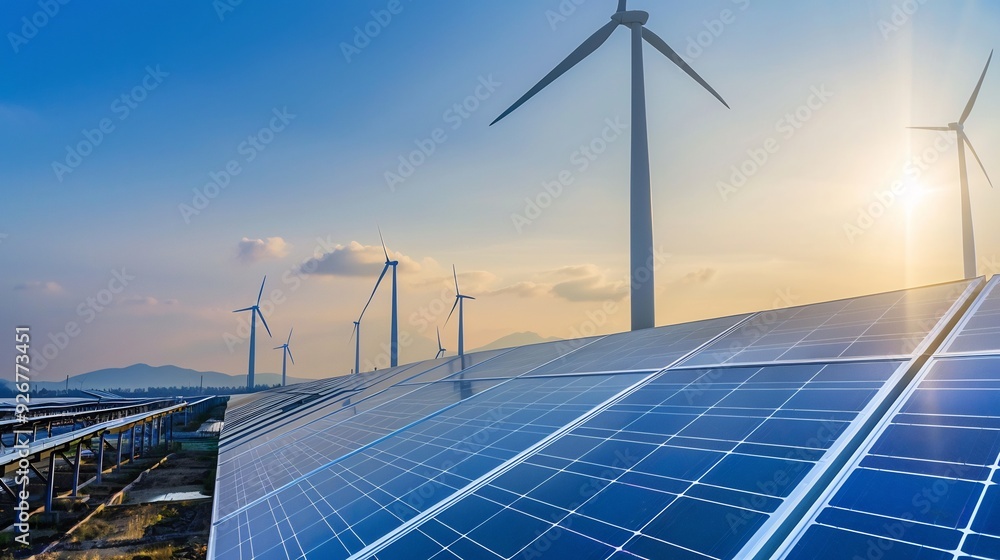 • Solar panels (solar cell) in solar farm with sun lighting to create the clean electric power