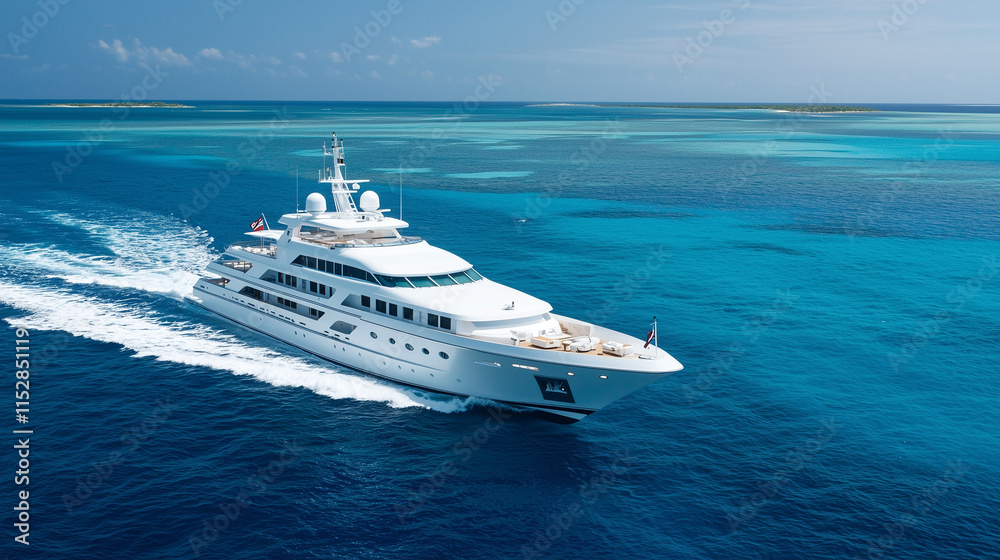 • Luxury Yacht Gliding Through Turquoise Waters: A majestic yacht cuts through the crystal-clear waters of a tropical paradise, leaving a trail of shimmering wake in its path.