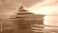 • Modern yacht sailing on ocean at sunset. Sky blends vibrant orange, pink, purple colors. Luxury boat, summer vacation at sea, sunset cruise concept, expensive lifestyle. Wonderful nature scene.