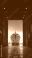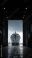 • Luxury yacht docked in shipyard hangar framed by industrial doorway under moody sky, dramatic reflective floor and symmetrical composition