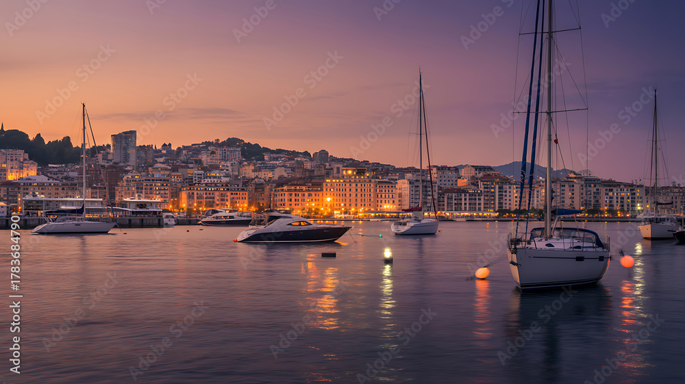 Plakat Jachty - Sailboats and yachts in harbor at dusk with city skyline marina #1783684790