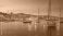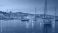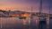 • Sailboats and yachts in harbor at dusk with city skyline marina