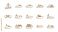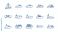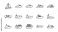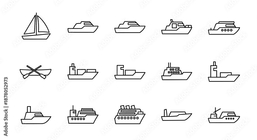 • Collection of diverse boat and ship vector icons, featuring a sailboat, yachts, cargo ships, ferries, and a rowboat with oars, presented as clean, ordered line art on a white background, perfect for