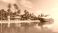 • Luxurious villa with palm trees and yacht. Private house on the island. Luxury yacht on the island background with villa. 3d illustration
