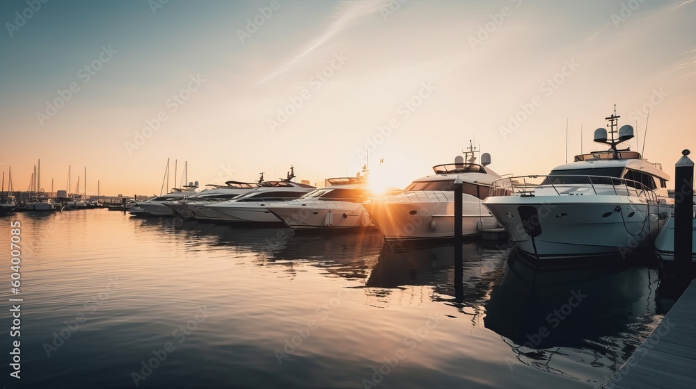 • Luxury yachts docked in sea port at sunset. Marine parking of modern motor boats and blue water Generative AI