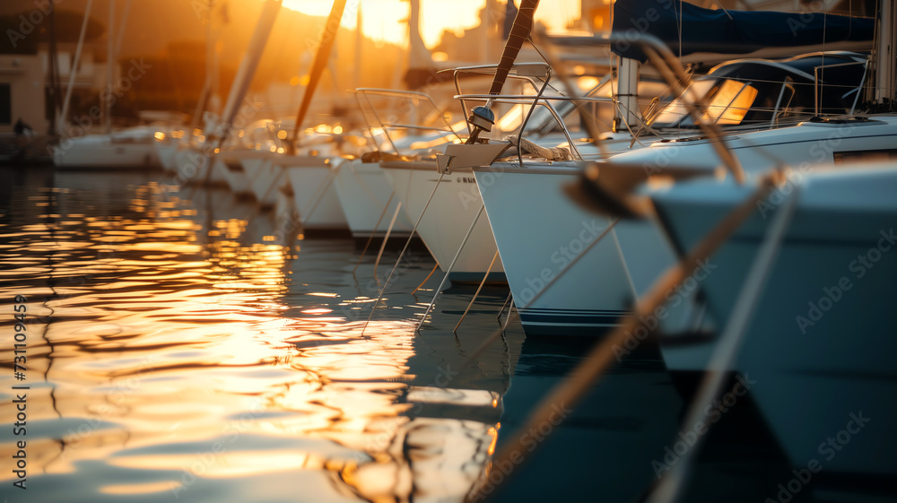 Plakat Jachty - sunset sailing yachts in marina mooring ropes #731109459
