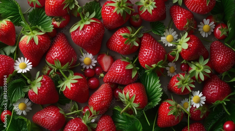 Plakat Jedzenie i Napoje - Duża grupa dojrzałych truskawek z zielonymi liśćmi i delikatnymi kwiatami. Owocuje w naturalnym... #812050984