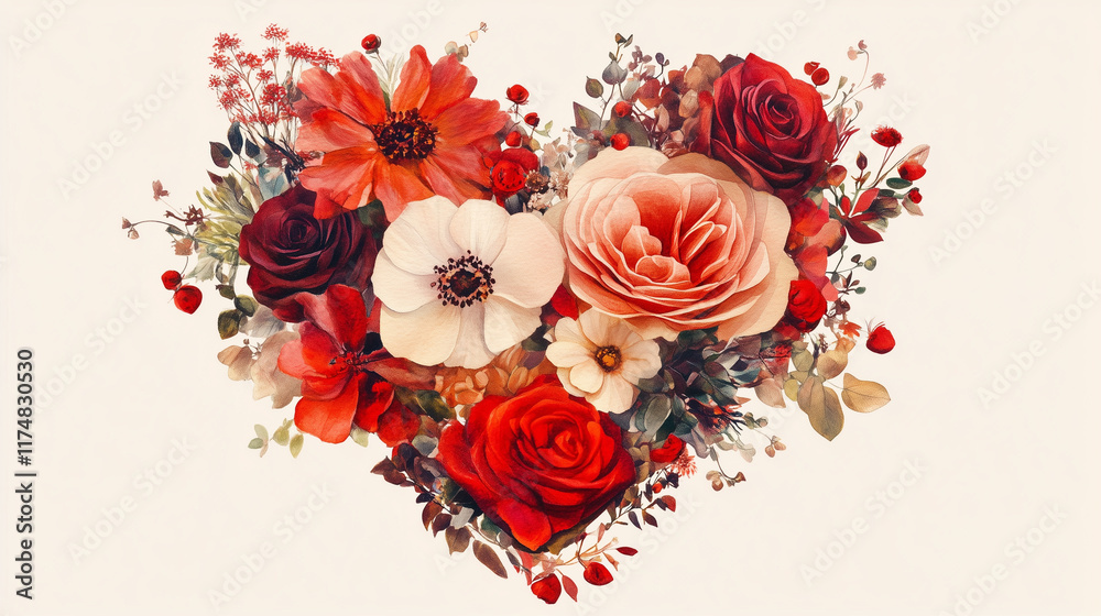 • Romantyczna kompozycja w kształcie serca, wypełniona delikatnymi kwiatami i subtelnymi dekoracjami, idealna na Walentynkowe kartki, zaproszenia lub projekty miłosne.