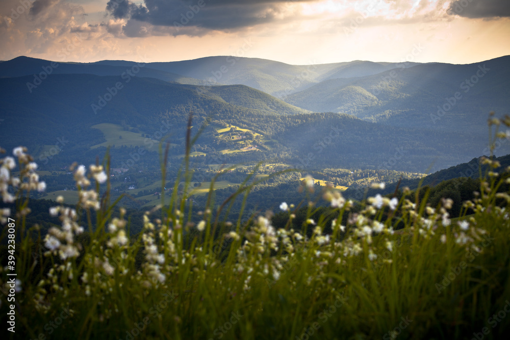 Plakat Kwiaty - Przepiękny widok na bieszczadzką dolinę, w której leży miejscowość Wetlina, Bieszczady, Polska #394238087