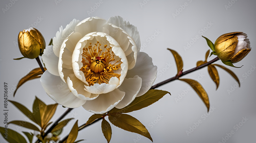Plakat Kwiaty - Wykonany w gipskie i pomalowany w złotym kolorowem obraz przedstawiający liście i kwiaty 3D.... #894316697