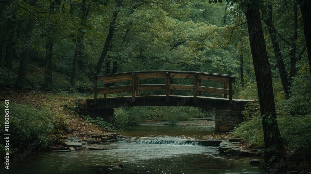 Plakat Mosty - Drewniany most w otoczeniu bujnej roślinności leśnej, z delikatnym deszczem i spokojnie płynącym... #1180061461