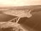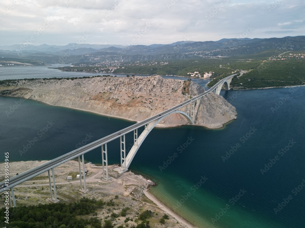 Plakat Mosty - Most na wyspie Krk - Chorwacja - długi most na 1,5 km podczas zachodu słońca. Zdjęcia z drona #1596904965