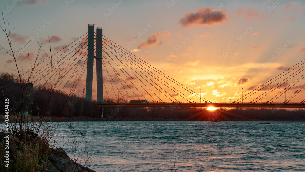 Plakat Mosty - most wiszący Wisła wschód słońca i chmury #470449428