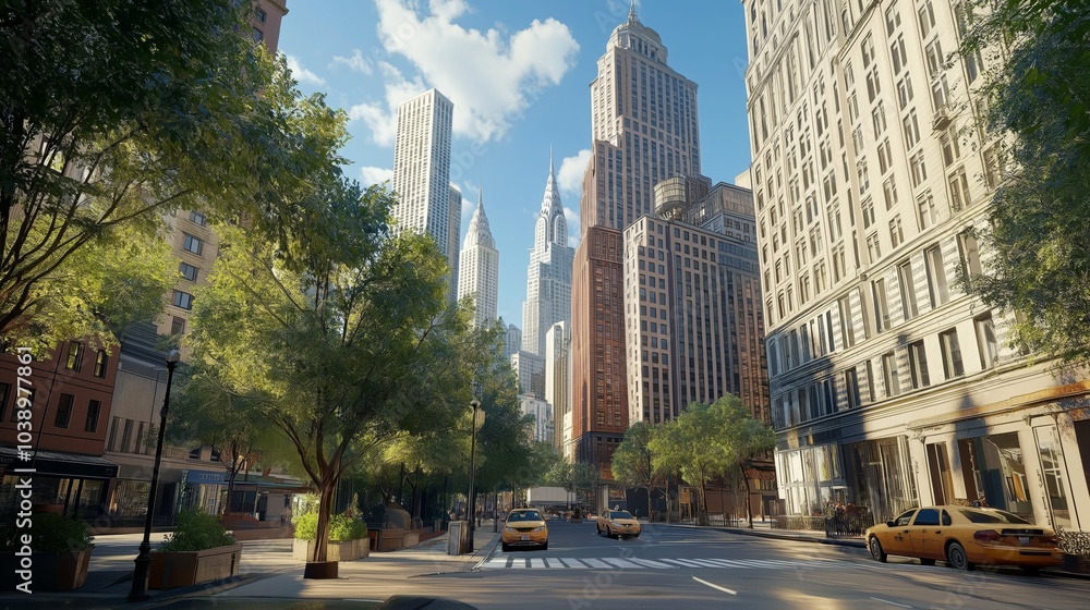 Plakat Nowy Jork - A peaceful summer day on the quiet streets of Manhattan, with tall skyscrapers and lush trees... #1038977861