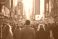 Blurred motion of traders and investors on a bustling stock exchange trading floor with numerous digital displays.