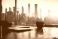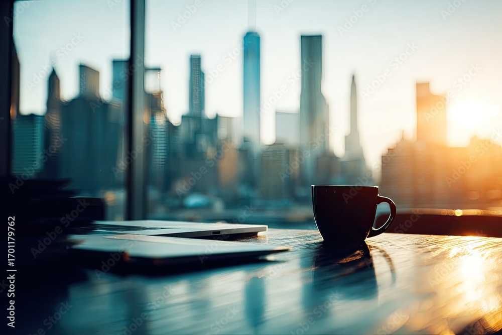 • Cityscape view from a modern workspace. A laptop and coffee cup sit on a wooden table, overlooking a blurred cityscape at sunrise