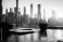 Plakat Nowy Jork - Cityscape view from a modern workspace. A laptop and coffee cup sit on a wooden table,... #1701179762