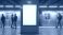 • Empty advertisement frame on subway station pillar. People and fast moving train pass by. Blank poster space for your ad message. Urban commute advertising display.