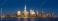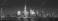 • Panoramic view of New York City Lower Manhattan skyline at dusk with the Hudson River. Illuminated skyscrapers of the Financial District and World Trade Center