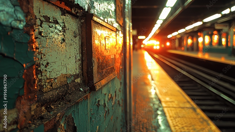Plakat Nowy Jork - Subway platform at sunset with approaching train and peeling paint #1916967700