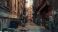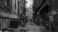 • A narrow alleyway with a dumpster and a fire escape